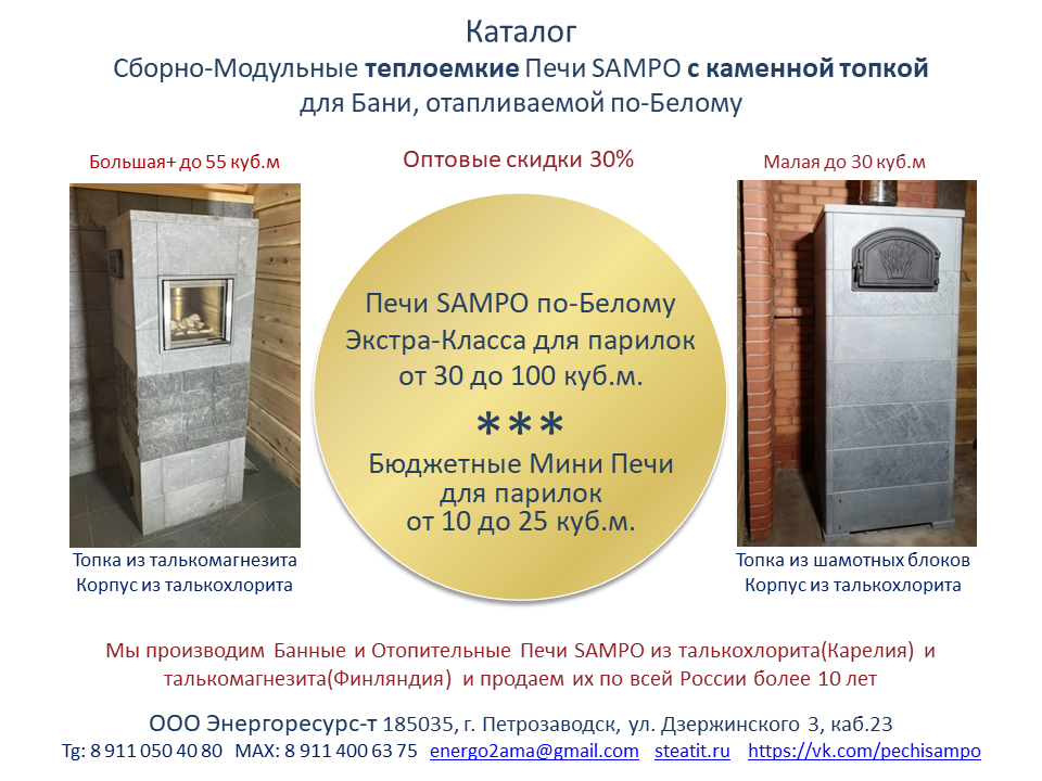 Компания ООО "Энергоресурс-т" производит Сборно-Модульные, теплоёмкие Банные Печи и Печи-Камины SAMPO из талькомагнезита и талькохлорита.