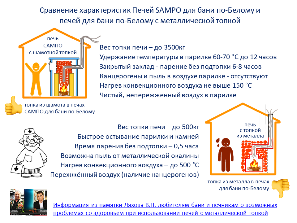 Печи SAMPO для Бани по-Белому имеют ключевые отличия перед печами с металлической топкой для бани по-белому: